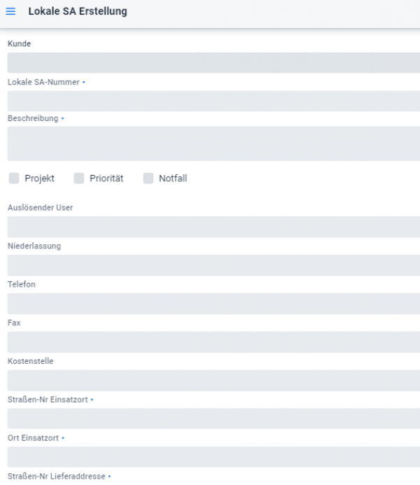 Sie sehen diesen Menüpunkt, wenn Sie dafür freigeschaltet wurden. In Ausnahmefällen können Sie einen Serviceauftrag auch direkt manuell erstellen. Dies ist eventuell dann notwendig, wenn seitens des Kunden keine Übertragung möglich ist oder en manueller Eintrag einfacher ist. Alle Felder mit * müssen ausgefüllt werden. Die lolake SA Nummer muss manuell vergeben werden.